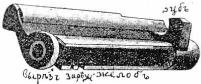 7. Внутри кожуха сзади сдѣлана винтовая нарѣзка, въ которую ввинчивается коробъ, и тамъ же снизу имѣется дыра для винта, скрѣпляющаго кожухъ съ коробомъ. Въ каналѣ кожуха – два кольца, въ видѣ выступа, для направленiя движенiя ствола при выстрѣлѣ.