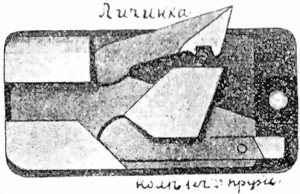 Планка имѣетъ двѣ дыры: первую для соска личинки, а вторую для винта планки и квадратное гнѣздо для выступа колѣнчатой пружины.