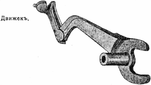 47. Къ шатуну на шарнирѣ прикрепленъ движекъ. Движекъ имѣетъ головку съ соскомъ съ правой стороны и вырѣзомъ спереди. Вырѣзъ ходитъ по малому гребню затвора, а сосокъ входитъ въ продольный его пазъ. Назначенiе движка – досылать патроны въ патронникъ.