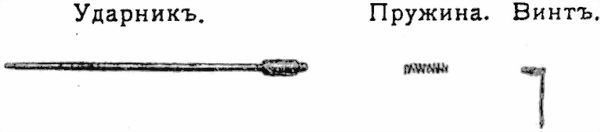 49. Ударникъ служитъ для воспламененiя капсюля; онъ имѣетъ стебель, оканчивающiйся бойкомъ, вѣнчикъ съ гнѣздомъ для винта ударника и хвостъ.