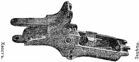 Сзади замочная коробка имѣетъ два хвоста, между которыми помѣщается шейка приклада. Замочная коробка соединяется съ прикладомъ посредствомъ хвостового винта (фиг. 42). Въ нижнемъ хвостѣ имѣется щель для помѣщенiя упора.