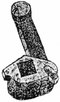 54. Возвратный рычагъ (фиг. 46) служитъ для сжиманiя возвратной пружины и для подачи ствольной коробки со стволомъ впередъ. Онъ имѣетъ квадратную дыру для надѣванiя на боевую ось, головку, которая, входя въ пазъ хвостовой планки ствольной коробки, соединяетъ рычагъ съ коробкою, и – сверху сзади проушины – для соединенiя рычага со стержнемъ возвратной пружины. Снизу рычагъ имѣетъ выступъ, которымъ онъ отводитъ ползунъ спускового механизма впередъ и который при автоматическомъ огнѣ надавливаетъ на автоматическiй спускъ.