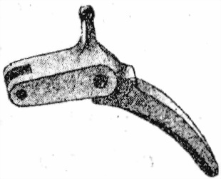 63. Спусковой крючекъ (фиг. 53) служитъ для опусканiя ползуна и тѣмъ для спусканiя курка съ боевого взвода. Онъ имѣетъ спереди проушины для соединенiя съ ползуномъ посредствомъ шпильки и сверху имѣетъ сосокъ, служащiй для передвиженiя впередъ и назадъ автоматическаго спуска. Снизу – гнѣздо для конца спиральной пружины.