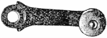 60. Упоръ (фиг. 50) служитъ для упора боевой и возвратной пружинъ. Онъ имѣетъ лапку, которой входитъ въ щель замочной коробки; двѣ дыры съ уступами – дыры для прохода скошенныхъ концовъ стержней, а уступы для упора пружины.