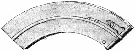 71. Патронная обойма (фиг. 61) назначена для помѣщенiя 25 патроновъ; она состоитъ изъ коробки, пустой внутри, съ концевъ открытой. Вѣсъ обоймы безъ патроновъ 89½ золот., а съ 25 патронами 2½ фун. Снаружи, на той стѣнкѣ, которая при стрѣльбѣ будетъ слѣва отъ стрѣляющаго, приклепана пластинчатая пружина и крючекъ (фиг. 62) съ зубомъ для задержанiя этой пружины. Эта боковая пружина служитъ для задержки патроновъ въ обоймѣ. Сзади и спереди обоймы имѣются два выступа для прочнаго укрѣпленiя обоймы въ прiемникѣ. При вставленiи обоймы въ прiемникъ крючекъ, попадая въ пазъ прiемника, отходитъ назадъ и автоматически освобождаетъ боковую пружину, отчего патроны будутъ выходить изъ обоймы. При вставленiи обоймы въ прiемникъ переднiй выступъ обоймы войдетъ въ переднiй вырѣзъ приемника, а заднiй – будетъ захваченъ и удержанъ на мѣстѣ защелкою, находящеюся въ прiемникѣ. Для подачи патроновъ, внутри обоймы помѣщается колѣнчатая пружина (фиг. 63), къ концамъ которой прикрѣплены: сверху пластинка (фиг. 64) а снизу – подаватель (фиг. 65). Верхняя пластинка образуетъ стѣнку и закрываетъ верхнее отверстiе обоймы, а подаватель прилегаетъ къ патронамъ и толкаетъ ихъ къ нижнему отверстiю. Обойму снаряжаютъ руками или снаряжателемъ.