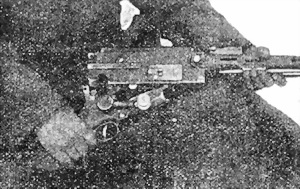 6. По всей длинѣ кожуха, для облегченiя его и для охлажденiя ствола во время стрѣльбы, сдѣланы продолговатыя отверстiя, а внизу кожуха имѣются, кромѣ того, двѣ круглыя дыры для того, чтобы можно было вставить отвертку для отвинчиванiя винтовъ, прикрѣпляющихъ прицѣльную колодку къ кожуху.