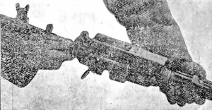 1) Отвинтить соединительный винтъ (фиг. 1). Положить ружье-пулеметъ рукояткой внизъ, взять правой рукой за головку соединительнаго винта и вывинтить его справа на лѣво.