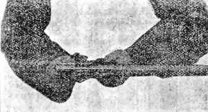 4) Вынуть затворъ. Положить стволъ затворной чекой кверху, вынуть чеку, для чего нажать большимъ пальцемъ лѣвой руки на пятку чеки, а указательнымъ пальцемъ правой руки захватить за головку ея и, приподнявъ, подать ее къ себѣ настолько, чтобы выступъ чеки пришелся противъ отверстiя въ ствольной коробкѣ. Затѣмъ, взявшись двумя пальцами правой руки, вынуть кверху затворную чеку (фиг. 4). Перевернуть стволъ съ коробкой на правый бокъ такъ, чтобы верхняя часть затвора пришлась съ наружной стороны.