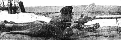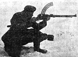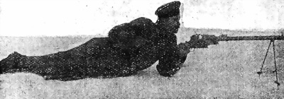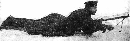 Установка прицѣла и заряжанiе производятся, какъ было выше описано при стрѣльбѣ лежа.
