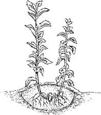 Высаженные растения, если это было сделано осенью, обрезают на высоте 7-10 см от уровня почвы и на зиму окучивают холмиком земли высотой 15-25 см. При весенней посадке растения только обрезают сразу после посадки, но не окучивают (рис. 6).
