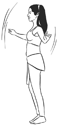 25. Станьте прямо, выпрямите руки в стороны, локти грациозно согнуты (не забывайте про восточную позу кистей рук). Выполните подъем грудной клетки вверх, затем опускание вниз. Движение происходит только в грудном отделе, остальная часть вашего тела остается неподвижной. Повторите упражнение на 30 счетов.