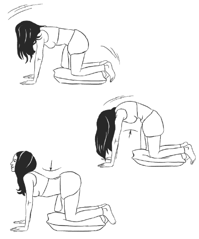 35. Оставаясь в предыдущем положении выполните поочередное покачивание бедер вперед так, чтобы верхняя часть тела оставалась неподвижной. Выполнив 15 покачиваний, переходите на быстрый темп так, чтобы движения были ритмичными и трепещущими. Повторите упражнение еще 15 раз.