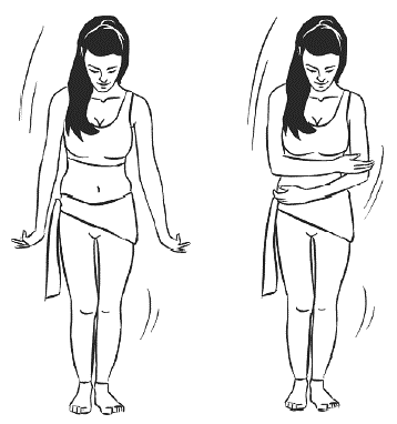 29. Станьте прямо, ноги на ширине бедер, руки свободно расположены вдоль тела. Выполните большие круговые движения бедер, сначала 10 раз на четыре счета: вправо, вперед, влево, назад. Затем выполните непрерывное движение бедер 20 раз на один счет. То же самое повторите в другую сторону, вращая бедра влево, вперед, вправо, назад и непрерывные движения на один счет.