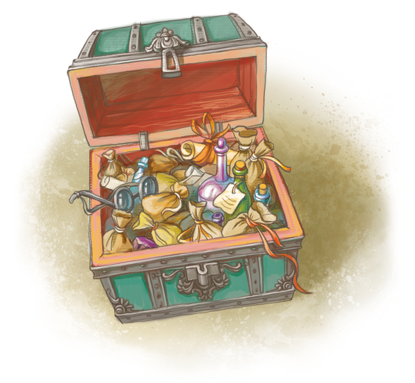 В сундуке лежали какие-то колбочки и замусоленные мешочки, перевязанные лентами. Ленты от старости начали тлеть и рассыпблись на отдельные нити при первом же прикосновении к ним. В надежде найти что-то ценное друзья немного порылись в сундуке, но не обнаружив ничего стоящего, растерянно посмотрели друг на друга. Их лица и руки были перепачканы – и неудивительно, ведь крышка сундука была покрыта толстым слоем пыли. Юра брезгливо отряхнулся и громко чихнул.