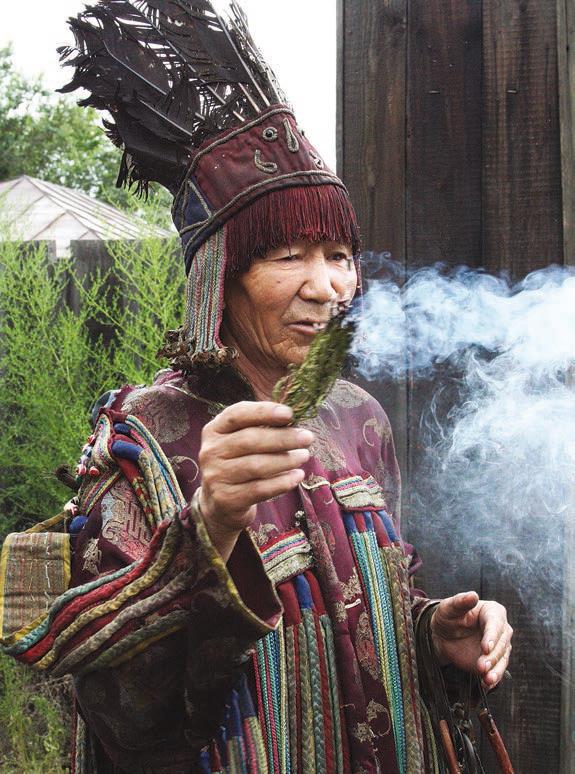 В таких условиях в СССР произошло переосмысление ценностей. Подрастающее поколение из числа коренных народов Сибири и Крайнего Севера стало сторониться опыта своих предков и древних обычаев. Мухоморы отошли в прошлое вместе с шаманами, но различные стимуляторы, способствующие отрешенности от обычного мира, остались. К растительным средствам, применяемым до сих пор в Сибири, относятся: багульник (Ledum palustrel, Ledum hypoleucum), можжевельник (Juniperas macropoda), полынь (Artemisia absinthium), чабрец (Thymus serpyllum L.) и др. При сжигании листьев этих растений образуется дым, создающий благоприятное пространство для проведения шаманского сеанса. Например, длительное вдыхание дыма от листьев и веток горного можжевельника – артыша – может вызвать опьянение, общее возбуждение, галлюцинации, бред и даже транс [21]. С помощью артыша тувинские шаманы очищают свой костюм и бубен перед камланием и считают его лучшим средством для изгнания злых сил (рис. 0.10). Схоже действует и багульник, который удэгейские, нанайские и нивхские шаманы бросают во время камлания в очаг или на раскаленную сковородку [22]. В Хакасии для этих целей традиционно используют чабрец (богородскую траву) [23]. Есть сведения об употреблении городскими шаманами белены, белладонны (красавки), дурмана, красного перца, гортензии, укропа, мускатного ореха и др.
