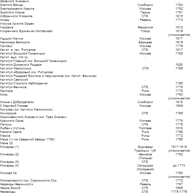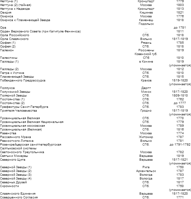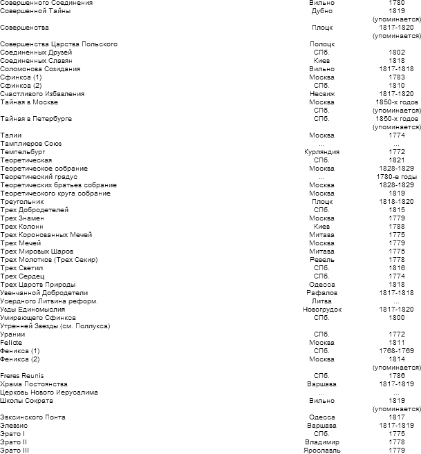 Внутренние масонские источники приводят длинный список таких организаций. И хотя часть этих организаций относится к последним десятилетиям XVIII века, большинство из них приходится на царствование Александра I.