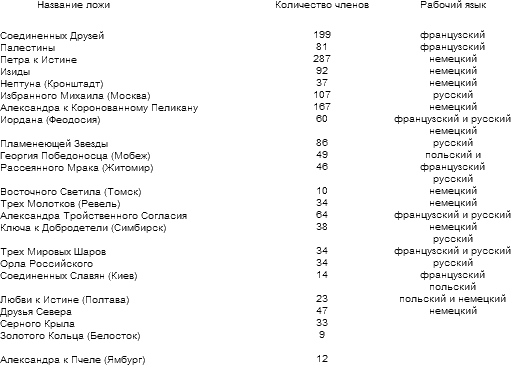 Для полной ясности приведем список главных лож, действовавших в царствование Александра I, с указанием численности и рабочего языка.[92]92 Составлено по: ОА, ф.1412, оп.1, д.4754, л.291…386.