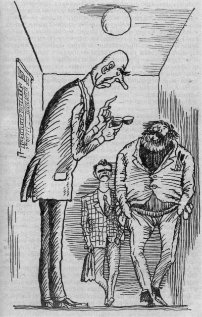 Арій Федорович підходив до вікна і з висоти другого поверху бачив, що тополиною алеєю до «Фіндіпошу» йде, як господар його, Стратон Стратонович Ковбик, а трохи далі за ним, наче вірний джура, простує Ховрашкевич. У першого обличчя, немов плоди груші сорту «добра Луїза», у другого бліде й зелене, наче спечене яблуко. На нього рідко падають сонячні промені, як на північний фасад «Фіндіпошу», а якщо й падають, то це вже не надає йому свіжості.