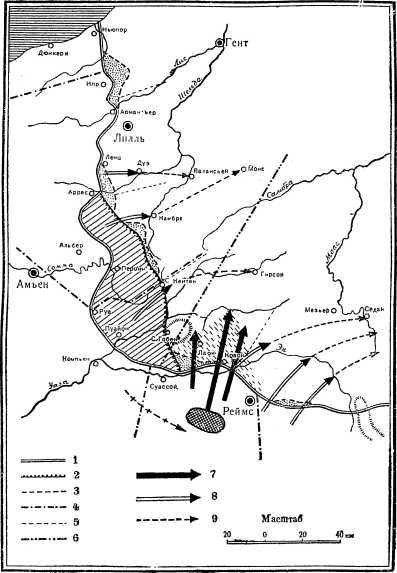Отход немцев на позицию Зигфрида, наступление французов (Нивеля) и наступление англичан под Аррасом и под Ипром в 1917 году: 1 – линия фронта перед отходом немцев, 2 – позиция Зигфрида, которую заняли немцы после отхода, 3 – линия фронта после наступления французов между Суассоном и Реймсом (Нивель) и после наступления англичан у Арраса и Ипра, 4 – границы между французскими и английскими армиями, 5 – то же между немецкими армиями, 6 – то же между немецкими группами армий, 7 – направление главного удара, 8 – направление вспомогательных ударов, 9 – направление ударов в случае удачи наступления.