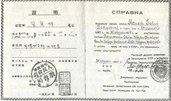 Документ отъезжающего харбинца. 1945 г.
