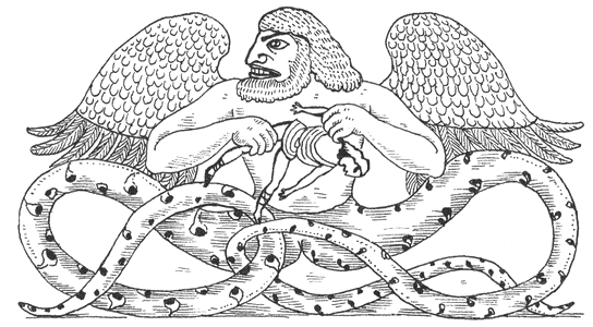 Что же касается Кампы, сторожившей гекатонхейров и погибшей от руки Зевса, то, насколько известно авторам данной книги, единственное (кроме Аполлодора) упоминание об этом страже (точнее, сторожихе) подземного мира имеется у Нонна Панополитанского – жившего в четвертом веке н.э. автора «Деяний Диониса», последнего эпоса Античности. Нонн работал в эпоху вполне историческую, причем в эпоху победившего христианства, и сведения о загадочной Кампе, погибшей за два тысячелетия до него (к вопросу о хронологии этой битвы мы еще вернемся), почерпнул, безусловно, даже не из третьих, а из десятых рук. Тем не менее живописует он ее настолько образно, что ради этого стоит прервать рассказ о гекатонхейрах. Впрочем, чудовище, способное удерживать трех сторуких великанов, само по себе достойно внимания. Согласно Нон-ну, Кампа насмерть стояла на своем посту, и победа далась Зевсу нелегко.