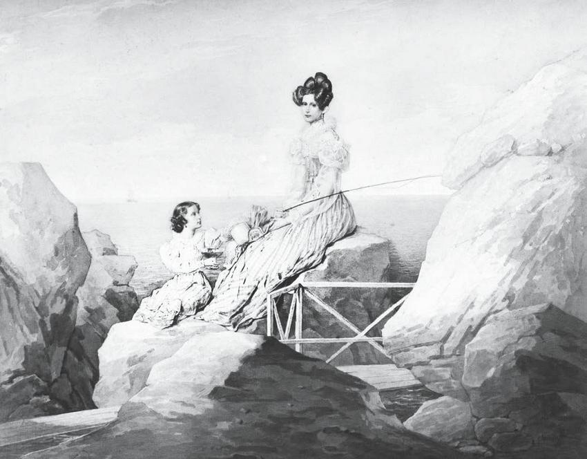 П. Соколов. Портрет императрицы Александры Федоровны с дочерью Марией на берегу Черного моря (1829)