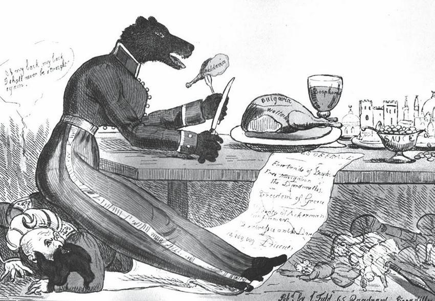 Многие за столом рассмеялись. Но не все. А те, кто понимал, в чем соль, начали давать объяснения не понявшим. По-английски индейка и Турция обозначаются одним словом – turkey, Turkey. И это расхожий образ политических карикатур, первей всего британских – как русский медведь задирает или готовится задрать турецкую индейку. С мидиями образ не такой расхожий, но одна карикатура стала известной (главное – что императору). Как медведь переходит Прут и гвоздит робких турецких мидий словами: «Клянусь Святым Николаем, я покажу вам, как нарушать соглашения!» И тут у англичан, а теперь и русских, тоже игра слов: mussels, что сходно по звучанию со словом мусульмане, на английском – моллюски, мидии. Отдав должное остроумию организаторов ужина, все приступили к поглощению поданного. И принялись хвалить гостеприимных хозяев, а также прекрасных поваров – мсье Анри и мсье Войцеха.
