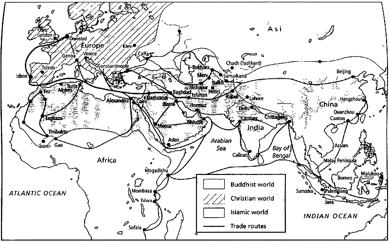 Рис. 2. Карта торговых путей русов и купцов-раданитов (ар-раззани) с территории империи франков через Испанию и Сев. Африку в Багдадский халифат согласно Ибн Хордабеху (на основе карты Smith R. The Cambridge World History, vol. 5)