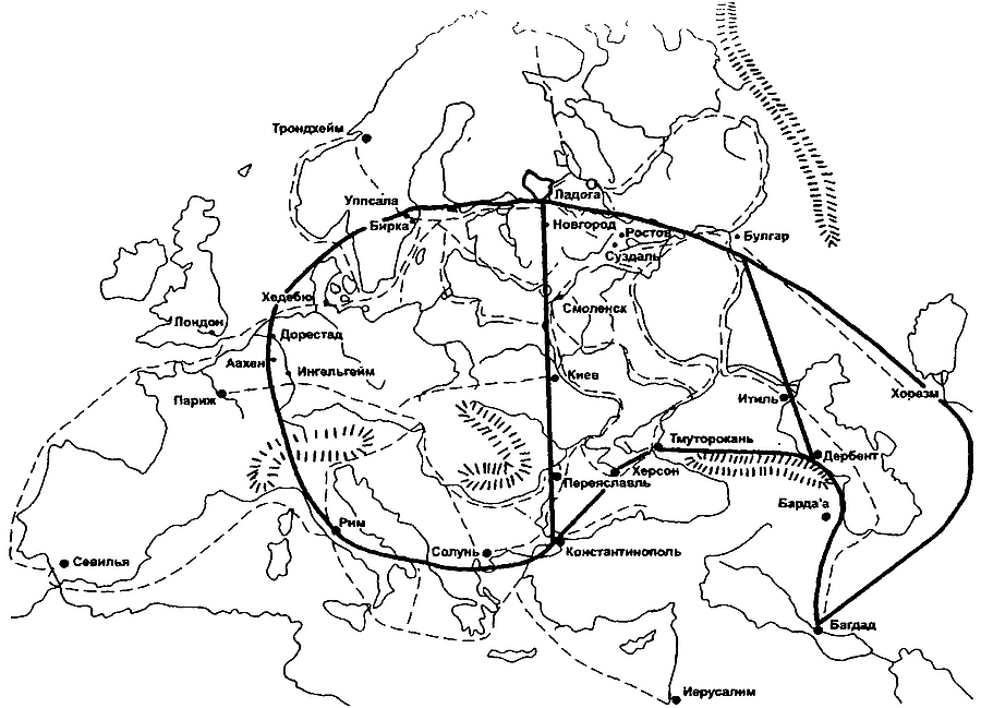 Рис. 6. Русь на Западе и на Востоке и торговые пути и направления походов в VIII–X вв. (карта из статьи Мачинского А. Д. Некоторые предпосылки, движущие силы и исторический контекст сложения Русского государства в середине VIII – середине XI в., 2009)