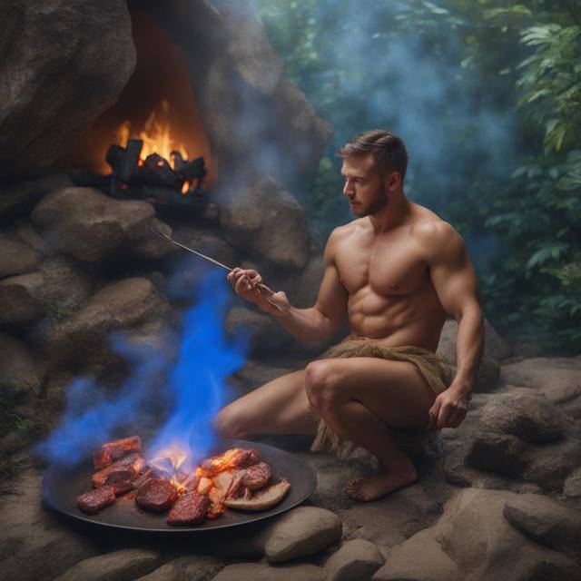 Человек сидел и ел что-то, обжаренное на костре.