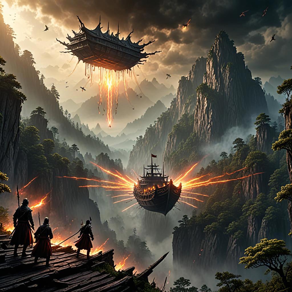 А тем временем висящий над полем битвы летающий деревянно-костяной корабль начал палить во все стороны без разбора, выжигая толстыми лучами воинов обоих армий. Ни одна защита, независимо от уровня не могла противиться этой силе.