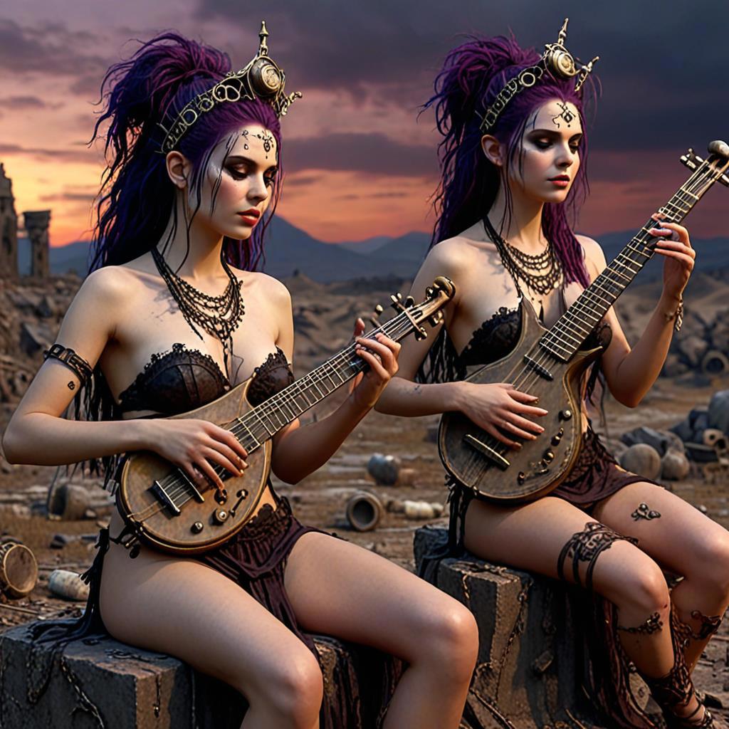 Сами инструменты... Хм... Вряд ли эти артефакты можно сравнить с чем-то привычным, они странноваты. Струнные далеко не всегда имели резонатор, а иногда совмещены с духовыми. Собственно подобия флейт и труб тоже имелись, но опять же не такие, какими пользуются смертные музыканты.