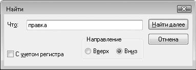 Если снова нажать кнопку Найти далее, поиск искомого текста будет произведен далее по документу – пока не будет достигнут конец текста. При этом переключателем Направление можно задать направление поиска (вверх или вниз по тексту). Если установить флажок С учетом регистра, будет произведен поиск фрагментов, у которых совпадает не только текст, но и регистр букв (строчные и прописные).