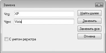 В приведенном примере в поле Что нужно ввести текст XP, а в поле Чем – Vista. Если нажать кнопку Заменить, первый же текст XP будет заменен текстом Vista. Нажатием кнопки Заменить все текст будет заменен во всем документе.