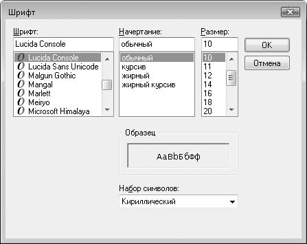 Команда Шрифт открывает диалоговое окно выбора шрифта и его атрибутов (рис. 6.16). Вы можете изменить шрифт документа, выбрать его атрибуты и размер. Следует учитывать, что в программе Блокнот возможность менять шрифт существует только для вашего удобства: если вам удобно читать или вводить текст определенным шрифтом, вы можете установить его, но Блокнот сохраняет документы в текстовом формате, который не поддерживает форматирование, то есть не содержит информации о шрифтах, поэтому при открытии созданного документа на другом компьютере или в другом редакторе шрифт текста может быть другим.