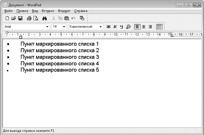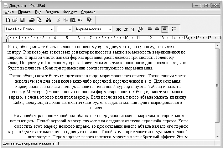 Главная особенность программы WordPad в том, что она предназначена для создания документов с поддержкой форматирования текста. Это означает, что вы можете изменять шрифт, его размер, атрибуты и цвет, менять тип выравнивания абзацев, создавать маркированные списки и т. д. Информация о форматировании будет сохранена вместе с файлом, поэтому документ, созданный в WordPad, будет открыт в другом редакторе и на другом компьютере в том виде, в котором он был создан. Создаваемый текст в области ввода вы также видите в том виде, в котором он будет напечатан на бумаге.