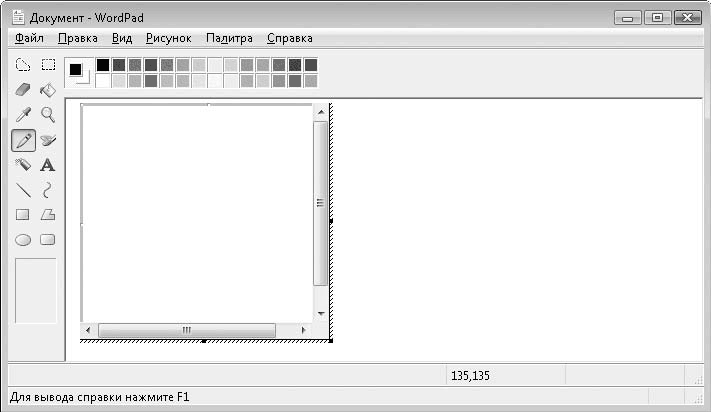 Заголовок окна программы говорит, что вы по-прежнему работаете с текстовым редактором, но панели инструментов и меню в окне программы заменились элементами интерфейса ранее рассмотренной программы Paint.