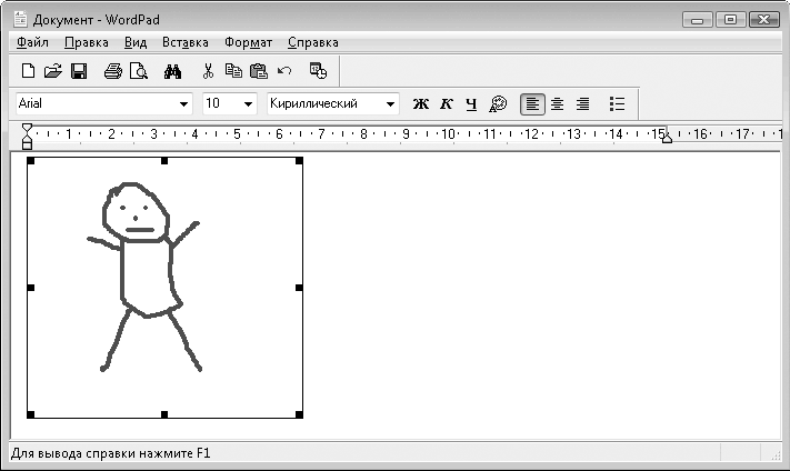 В области ввода текста появился прямоугольник. В этом прямоугольнике вы и рисуете нужную картинку, используя методы, рассмотренные при изучении программы Paint. Когда изображение готово, нужно переместить указатель за пределы области рисования – его вид изменится на текстовый курсор. Убедившись, что указатель мыши принял вид курсора, щелкните кнопкой мыши. Интерфейс программы WordPad примет первоначальный вид, а в тексте появится нарисованная вами картинка (рис. 6.23). Чтобы вернуться к ее редактированию, следует щелкнуть на ней кнопкой мыши. WordPad снова позаимствует элементы интерфейса у программы Paint, и вы можете править рисунок.