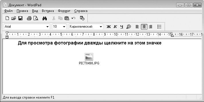 Таким же образом можно вставлять в документ страницы PDF, электронные таблицы и т. д. Следует помнить, что если вы попытаетесь открыть документ со вставленными объектами на другом компьютере, то для просмотра внедренных объектов на нем должны быть установлены соответствующие программы, так как WordPad заимствует их библиотеки.