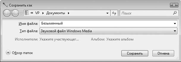 Как только вы нажмете кнопку Остановить запись, появится стандартное диалоговое окно Сохранить как (рис. 6.26). Записанный звуковой файл предлагается сохранить в формате WMA (Windows Media Audio). Тип файла выбирать нельзя, можно только дать имя файлу и выбрать папку его размещения.