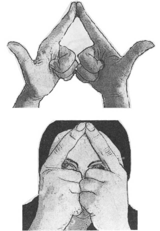 Как видно из первого рисунка, вначале мы складываем пальцы так, что образуется подобие креста. Пальцы одной ладони разделяют другую ладонь на две части и наоборот. Одна ладонь, как бы входит в другую ладонь. При этом плоскости ладоней располагаются под углом 90 градусов.