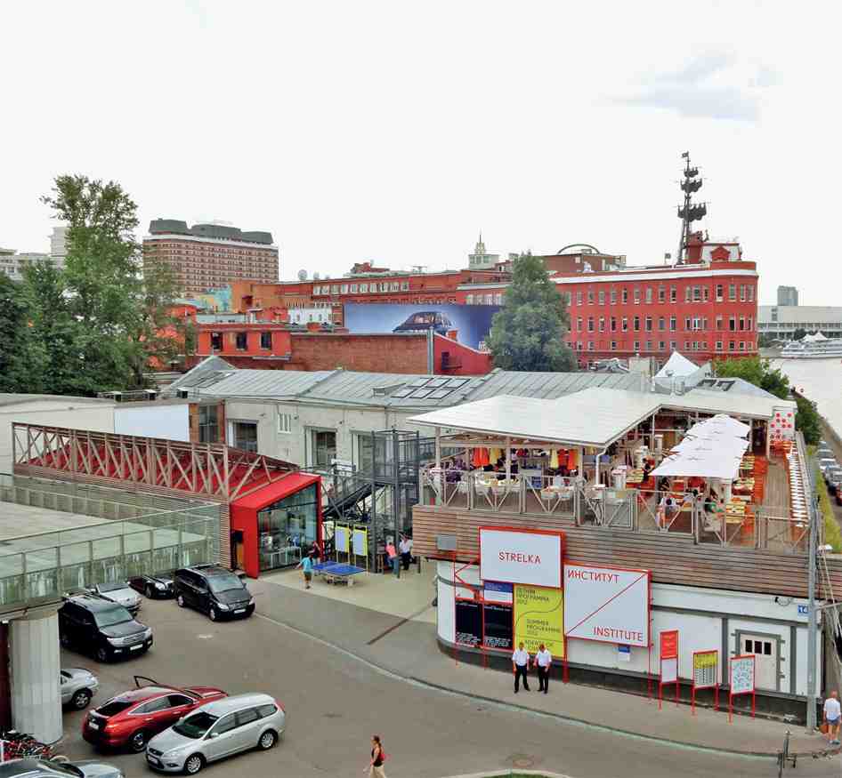 Перед вами первые объекты острова. Открытая веранда летнего ресторана, бар «Арт-Стрелка», рядом летний кинозал и корпус с лекториями. Справа от них красные здания – часть корпусов фабрики «Красный Октябрь».