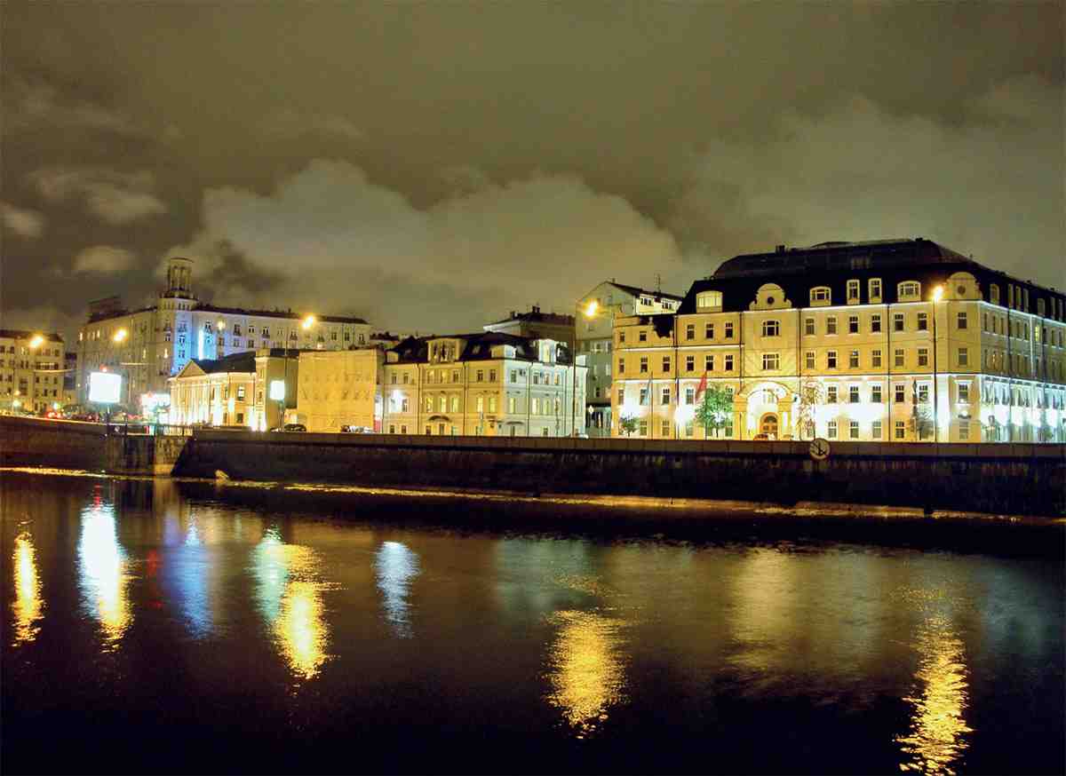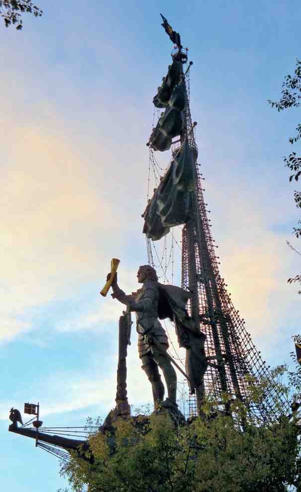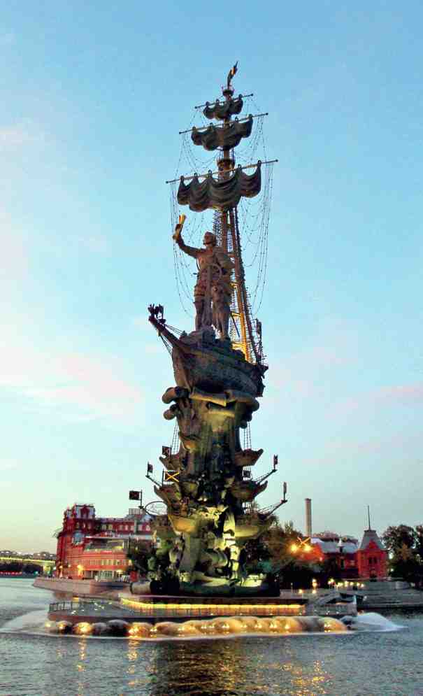 Мы не будем углубляться в квартал, а пойдем вдоль по набережной. Ориентир – справа все тот же «Петр». Прекрасная возможность оценить странное творение Церетели вблизи. Кстати, у реки он еще любопытней. Бурлящий фонтан в основании памятника символизирует разбивающий волны корабль. Немного нелепо, но эффектно.
