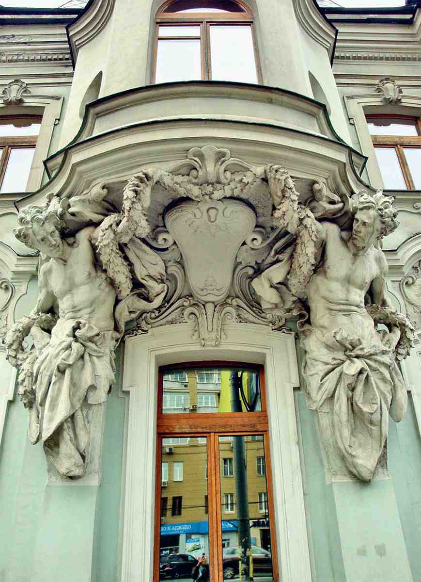 Фигуры атлантов создал знаменитый скульптор С. Т. Коненков.