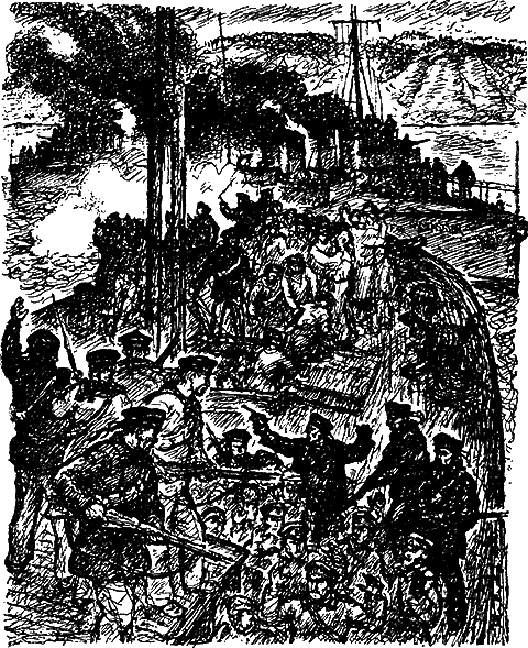 Вышли. Наконец и село Гольяны показалось за поворотом реки. А посреди реки – баржа. На ней – охрана. С берега на баржу наведены пушки и пулеметы. Подошли наши миноносцы к барже, развернулись. Часовые с баржи их окликают: «Кто плывет?» С миноносцев – приказ: «Барже поднять якоря! Приготовиться к буксировке!»