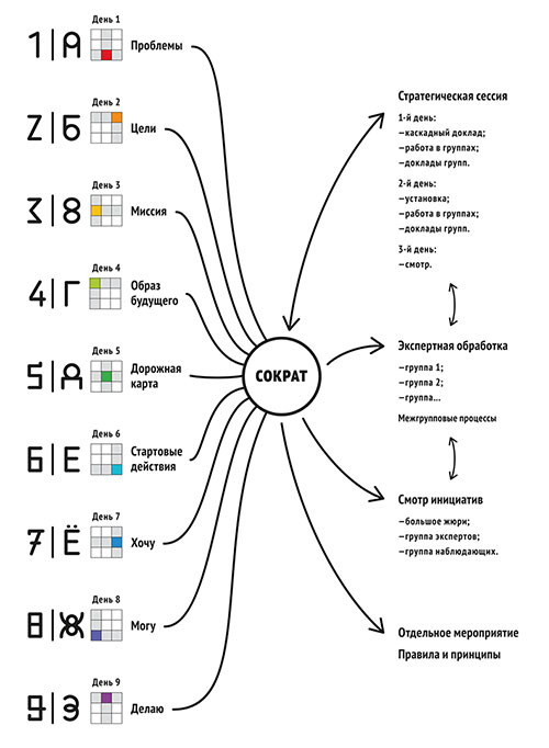 На рис. 1.4 показано, как на основе базовых технологических СТ девять элементов отдельного мероприятия КГС включены в 9-этапную схему динамики групп, создание которых инициируется серией знаньевых стратегических сессией и смотров результатов групповой работы. Знаньевая стратегическая сессия – это точка приращения знаний, генератор групп и координаторов групповой работы. Сгенерированных групп, как правило, много (например, в проекте «Московское долголетие» – это сотни тысяч участников и, соответственно, тысячи групп). Они работают параллельно, и практически невозможно организовать все необходимые межгрупповые мероприятия для интеграции результатов работы всех групп-участниц. Поэтому применяется специальная экспертная процедура СОКРАТ, позволяющая в автоматическом режиме, с привлечением специально подготовленных экспертов, смоделировать полное множество вариантов межгрупповой работы, проверить и обобщить полученные результаты работы групп на новизну, полноту и преемственность.