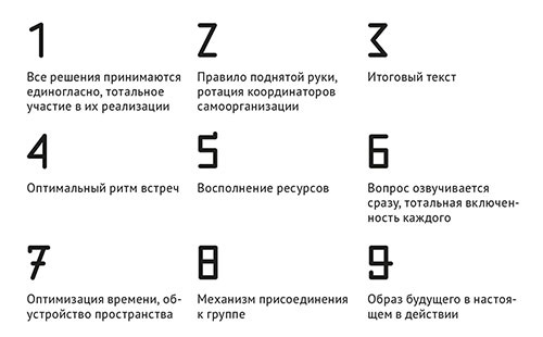 Три первых правила отражают процедуру принятия решений и формат результата групповой работы. Следующие три правила ориентированы на регламент и ресурсное обеспечение групповой работы, последние три отражают правила развития группы и условий реализации решений в совместных объявленных действиях: