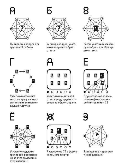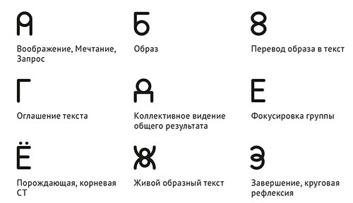 Выполнение элементов отдельного мероприятия (вопрос – получение образа – его перевод в текст – оглашение – слушание/видение – фокусировка – усиление групповой фокусировки за счет выделения стержневой/корневой СТ – расширение СТ в форму текста – завершение мероприятия рефлексией) хорошо иллюстрируется модифицированной графикой девяти букв старославянского языка (рис. 1.6).