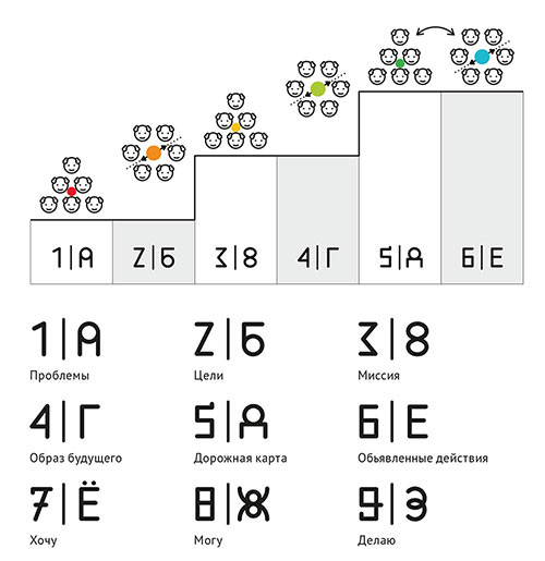 4|Г Четвертый этап. Формирование образа будущего. Движущей силой и основным мотиватором деятельности группы здесь является образ будущего, приведенный в настоящее через ретро-дорожную карту (пятый этап), и формирование стратегии и заявленных стартовых коллективных действий (шестой этап, рис. 1.10). Образ будущего (видение) – это представление, описание будущего как кульминационного момента некоторой истории предполагаемых действий и событий. Этот образ выступает финалом реализации сценария истории, проживаемой ее участниками, в котором самый минимальный элемент – это кадр, слайд из будущего, проявляющийся здесь и сейчас.