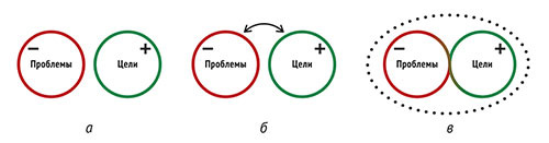 2|Б Второй этап – целеполагание. Цель возникает, когда в деятельности появляется сбой/проблема. Тогда автоматическая операция деятельности превращается в действие, которое имеет целевой характер. Цель – это задача, ответ которой находится в плоскости будущего, она имеет сослагательное наклонение и ее нельзя ощутить прямо сейчас, для этого нужен образ. Цель – это намеренный результат/продукт, который группа хочет получить. Цель задает направление движения, формулируемое, как правило, принципом отрицания (мало денег – найти деньги). На этом этапе важно видеть одновременно и раздельно проблему с целью, но при этом понимать их совместный групповой эффект, который дает энергию изменений. Таким образом формируется опыт видения: отдельно проблемы и цели (рис. 1.9, а), их взаимодействие (рис. 1.9, б) и объединение (рис. 1.9, в). Процесс формирования цели редко включает в себя описание того, что будет после её достижения. Группа на этом этапе, как правило, остается в проблемной культуре, поэтому ей необходим переход в пространство формирования миссии, фиксация его образом будущего, возвращение через ретро-дорожную карту в настоящее, чтобы стратегически вырваться из «проблемного болота».